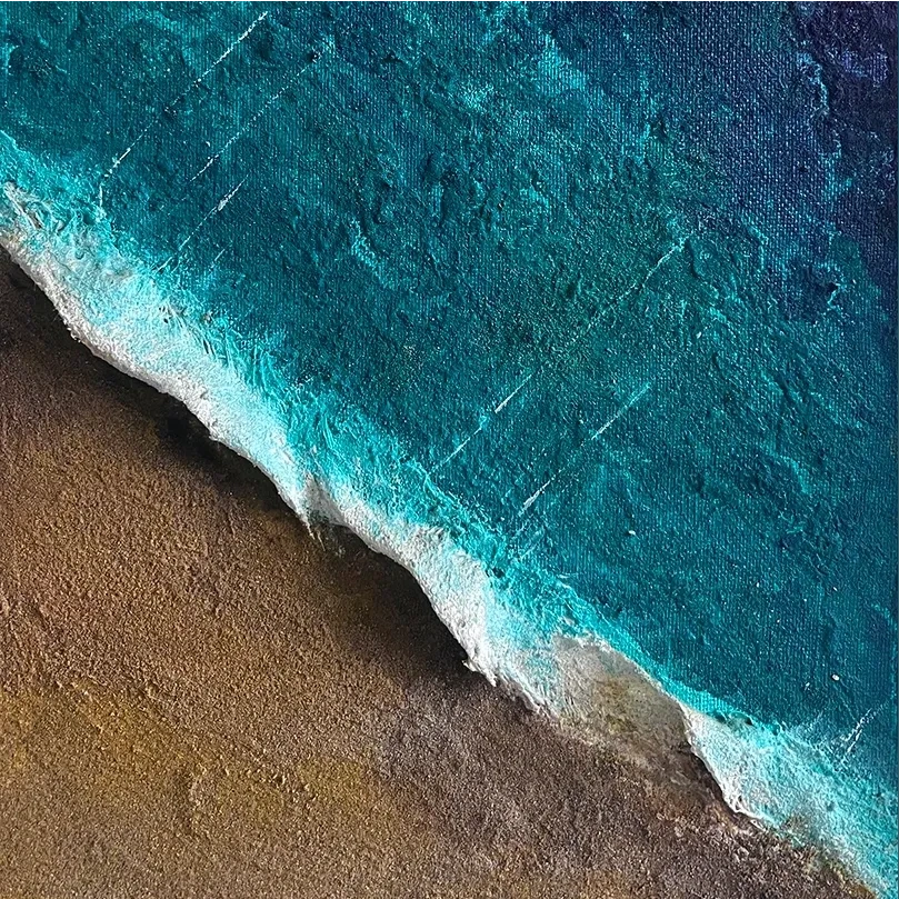 The ocean has always been where I feel a strong sense of connection, and it continues to inspire my artwork. I create textured seascapes using sand, acrylic and fibreglass, building layers that echo the depth and movement of the sea. I also work with resin, which brings a completely different quality. It is smooth, glossy and fluid, capturing the reflective, luminous surface of water. Each medium explores different aspects of the ocean, yet both aim to evoke a quiet sense of connection.